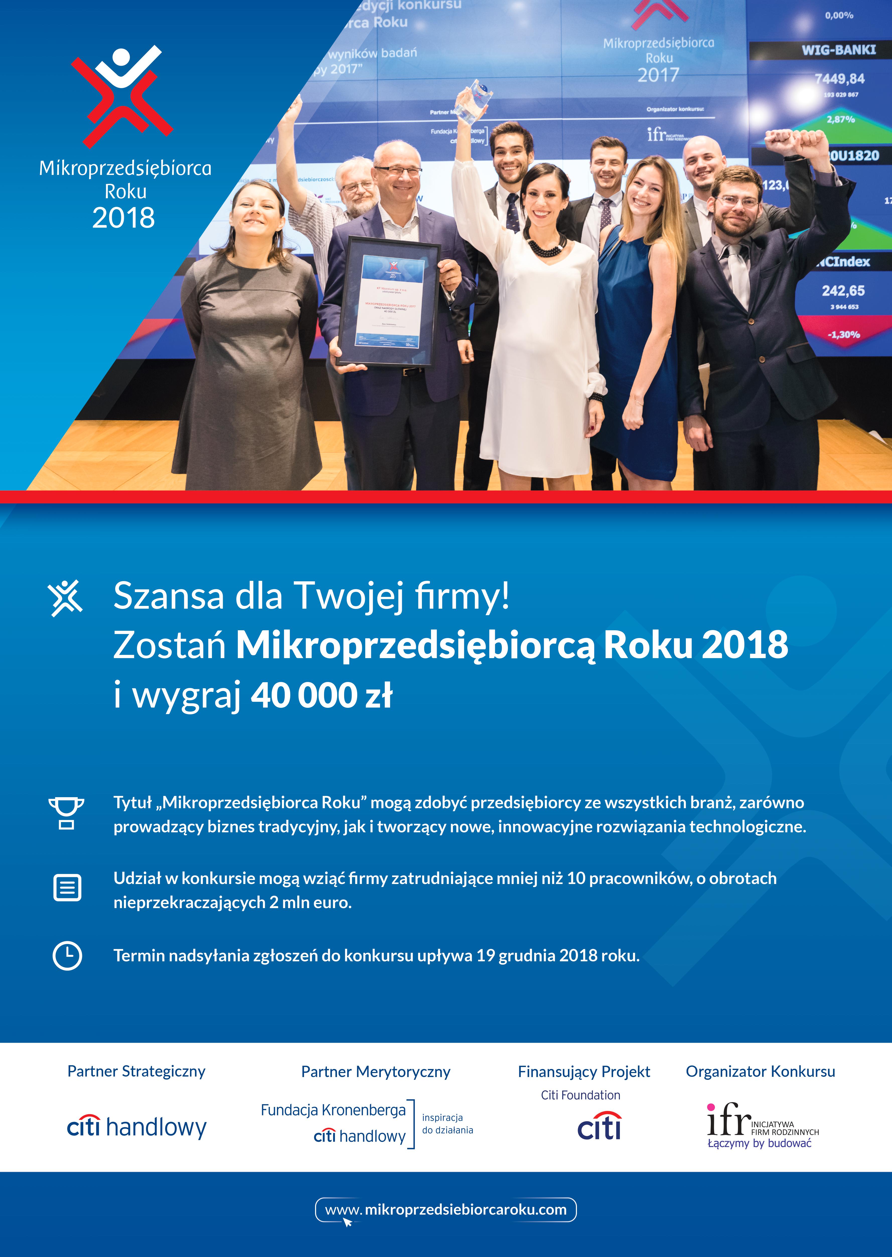 Ruszyła kolejna edycja Konkursu Mikroprzedsiębiorca Roku, skierowanego do mikroprzedsiębiorstw, zatrudniających nie więcej niż 10 pracowników oraz o obrotach nieprzekraczających 2 mln euro. Celem Konkursu Mikroprzedsiębiorca Roku 2018 jest promocja nowoczesnych inicjatyw, które wyróżnia nie tylko efektywność, ale również zaangażowanie i społeczna odpowiedzialność.