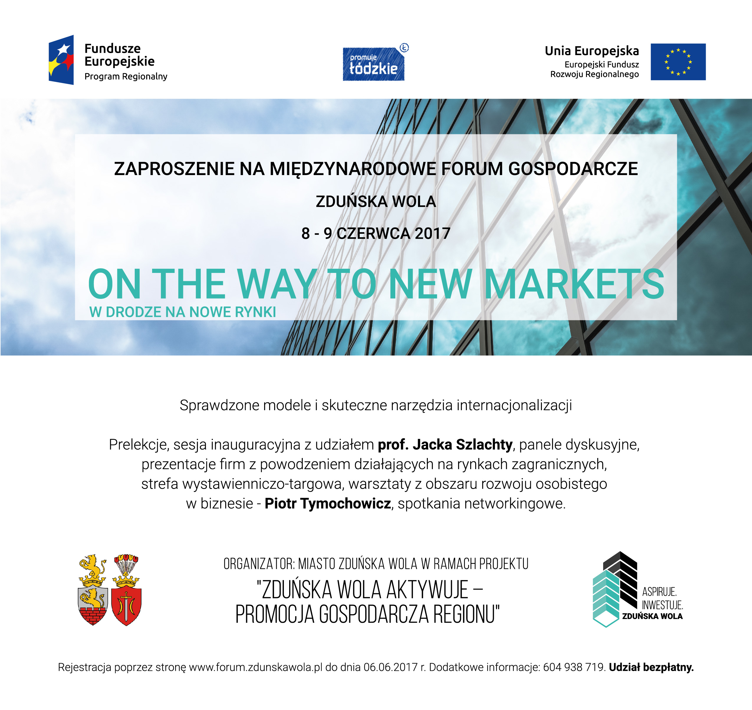 MIĘDZYNARODOWE FORUM GOSPODARCZE "ON THE WAY TO NEW MARKETS. W drodze na nowe rynki" to największe wydarzenie gospodarcze 2017 roku w Zduńskiej Woli. Poświęcone najważniejszym aktualnym tematom gospodarczym, związanym przede wszystkim z internacjonalizacją firm - modelami i narzędziami rozszerzania działalności gospodarczej przedsiębiorstw na zagraniczne rynki. W programie znajdziecie Państwo prelekcje, wykłady, panele dyskusyjne. Ponadto sesje poświęcone prezentacjom dobrych praktyk – sprawdzonych sposobów wejścia na zagraniczne rynki.