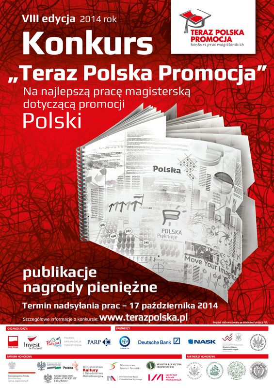 Już po raz ósmy wystartował Konkurs „Teraz Polska Promocja”. Na laureatów najlepszych prac magisterskich dotyczących promocji Polski czekają nagrody pieniężne - o łącznej wartości ok. 50.000 zł., publikacje, a także praktyki i staże.Prace można zgłaszać do 17.10.2014.
