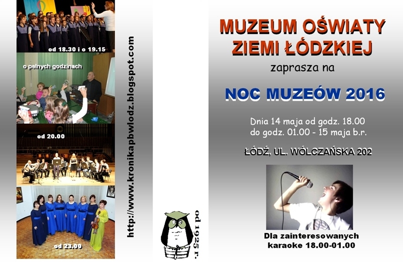 Tegoroczną Noc Muzeów Pedagogiczna Biblioteka Wojewódzka im. prof. T. Kotarbińskiego w Łodzi w Muzeum Oświaty Ziemi Łódzkiej obchodzi pod hasłem: „Co nam w duszy gra… czyli muzyka i śpiew w dawnej szkole”.