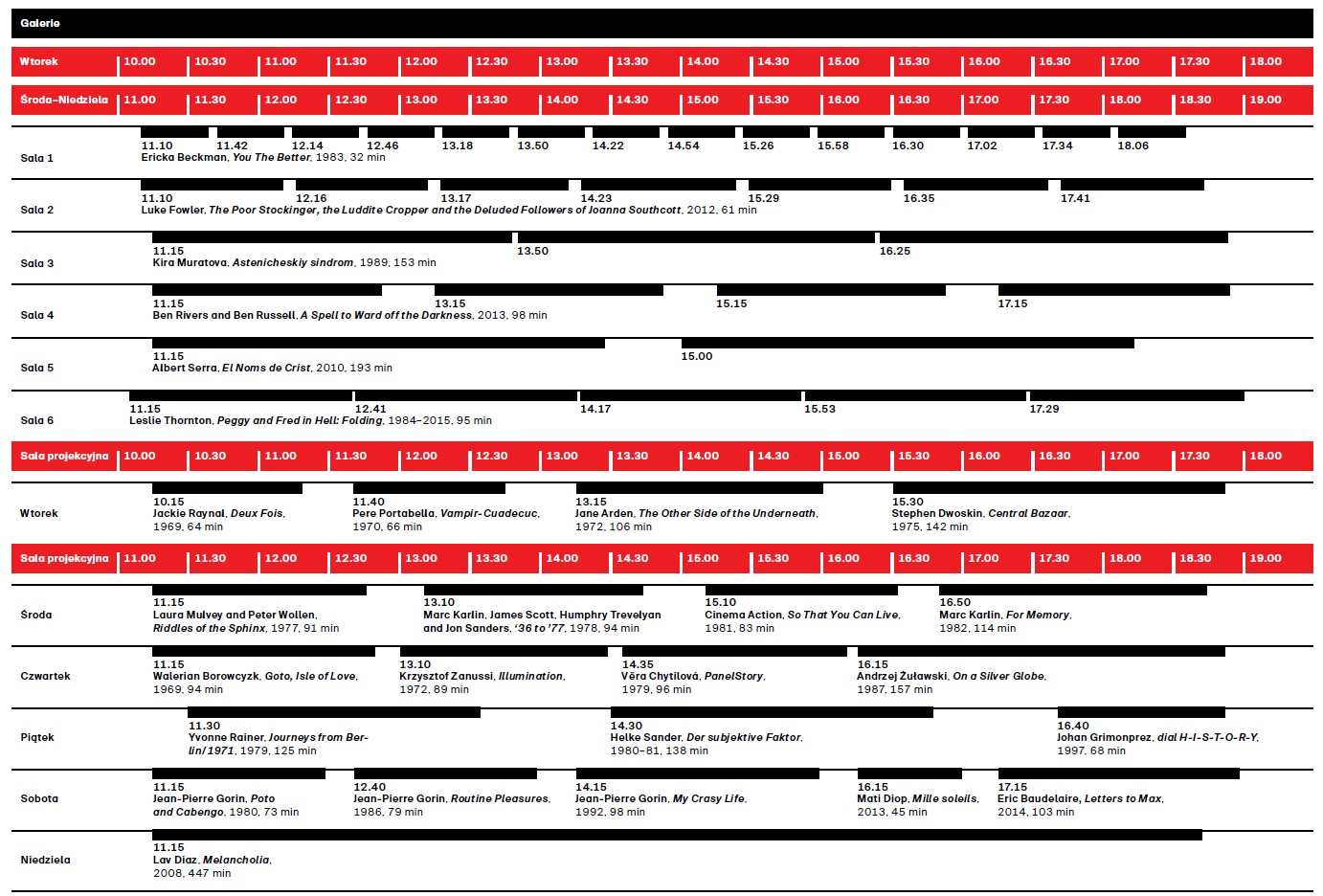 W każdej z sześciu dźwiękochłonnych sal pokazywany będzie jeden wyświetlany kilkakrotnie w ciągu dnia obraz, w usytuowanej zaś w centrum galerii większej „sali kinowej” każdego dnia tygodnia zostanie wyświetlony inny zestaw filmów. Tydzień rozpoczyna się od prac nakręconych pod koniec lat 70., a kończy w każdą niedzielę filmami powstałymi po 2000 roku. Aby umożliwić odwiedzającym zapoznanie się z bogatym programem, Muzeum Sztuki w Łodzi przygotowało również bilet wielokrotnego wstępu na ekspozycję.
