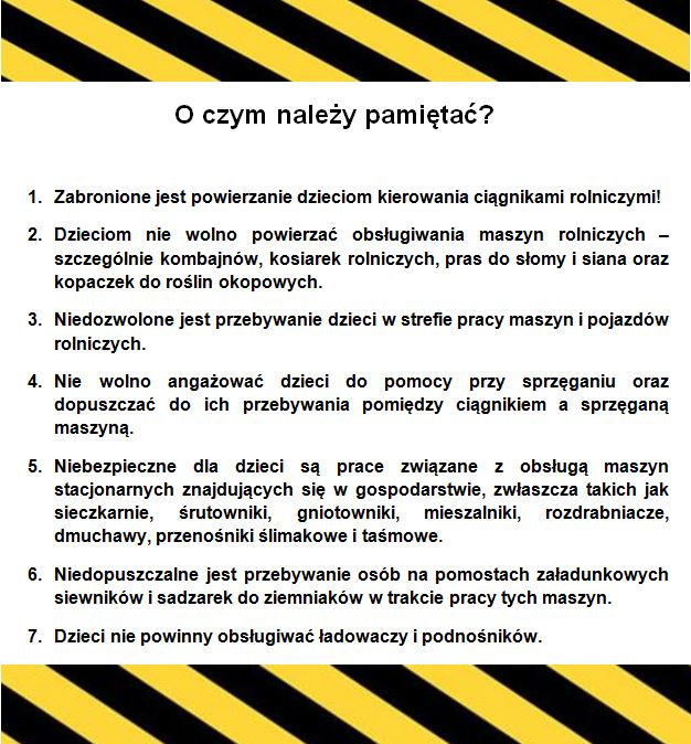 Pomocnym w wyeliminowaniu zagrożeń może okazać się wykaz czynności szczególnie niebezpiecznych, związanych z prowadzeniem gospodarstwa rolnego, których nie powinno się powierzać dzieciom poniżej 16 roku życia. Wykaz został stworzony przez Główny Inspektorat Pracy z nadzieją, że stanie się on wskazówką dla rodziców w zakresie niezbędnej wiedzy na temat bezpieczeństwa.