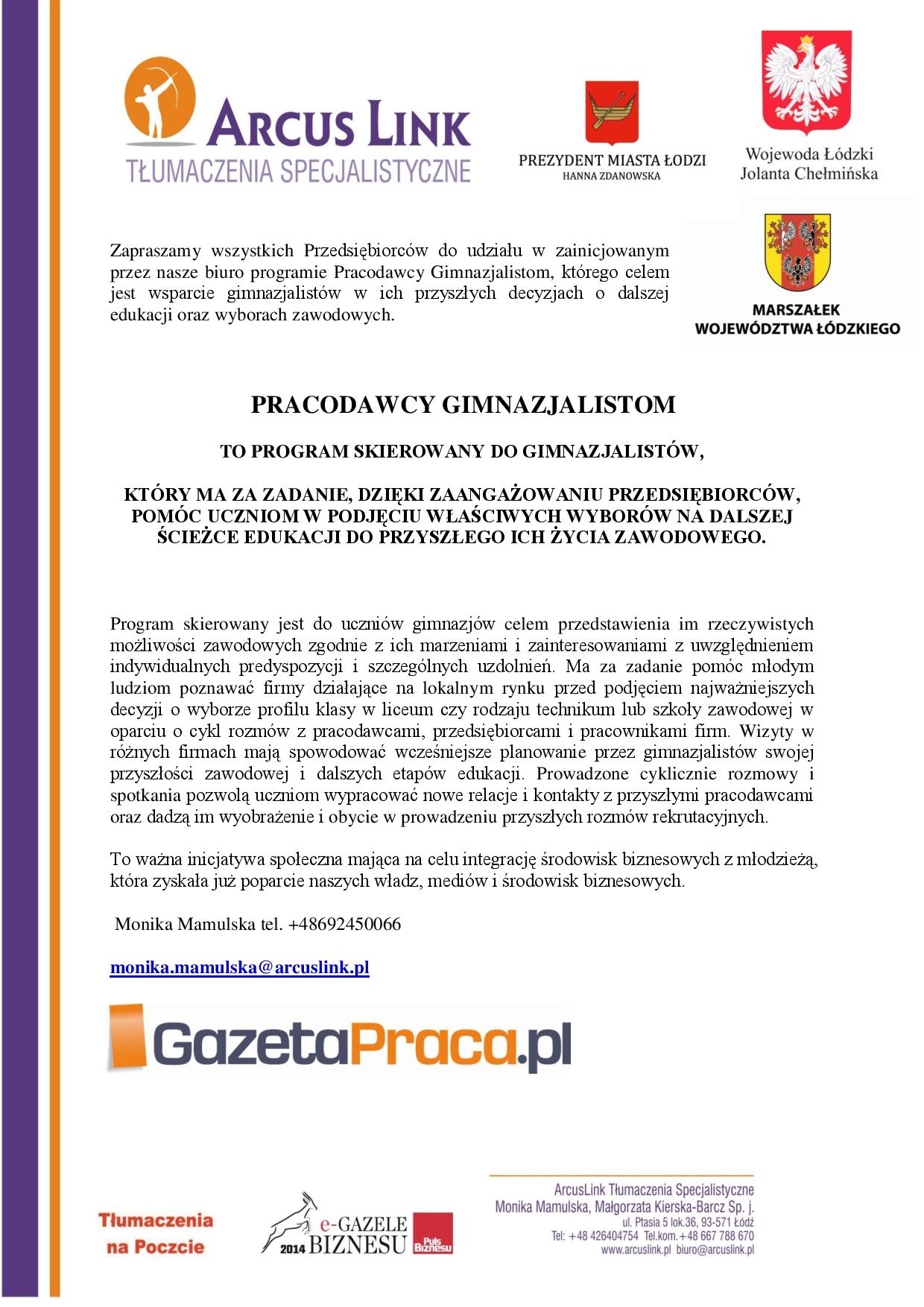 Zapraszam wszystkich chętnych przedsiębiorców do przystąpienia do programu wspierającego gimnazjalistów, to ważna inicjatywa społeczna mająca na celu integrację środowisk biznesowych z młodzieżą, a jako autor programu zobowiązuję się udzielić Państwu merytorycznego wsparcia w jego realizacji.