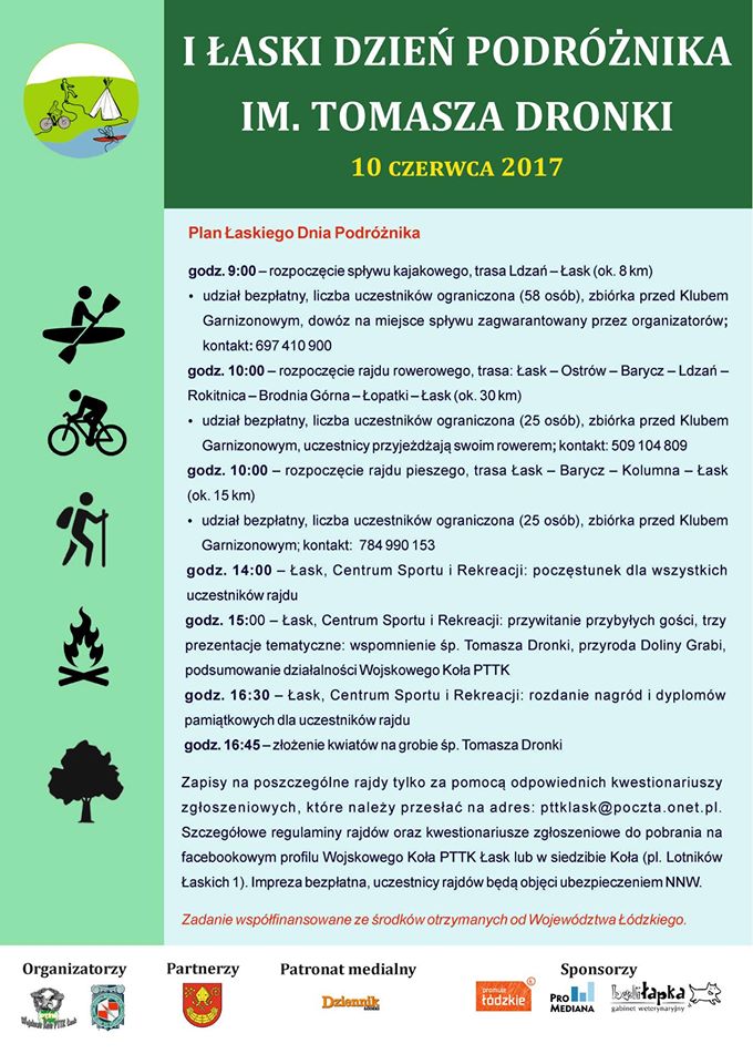 Aby upamiętnić Tomasza Dronkę w 1 rocznicę Jego śmierci przyjaciele z Łasku organizują to, co kochał: turystyczne wyprawy kajakiem, rowerem i pieszo