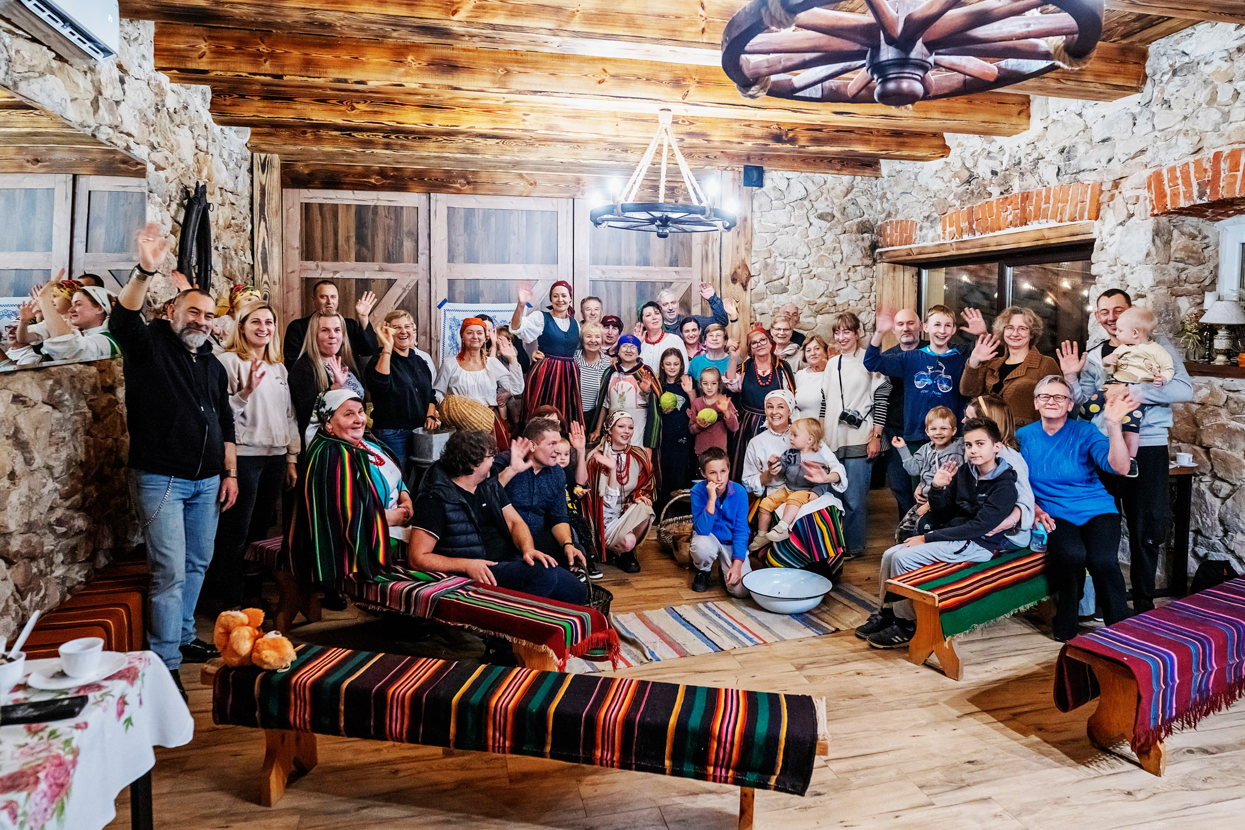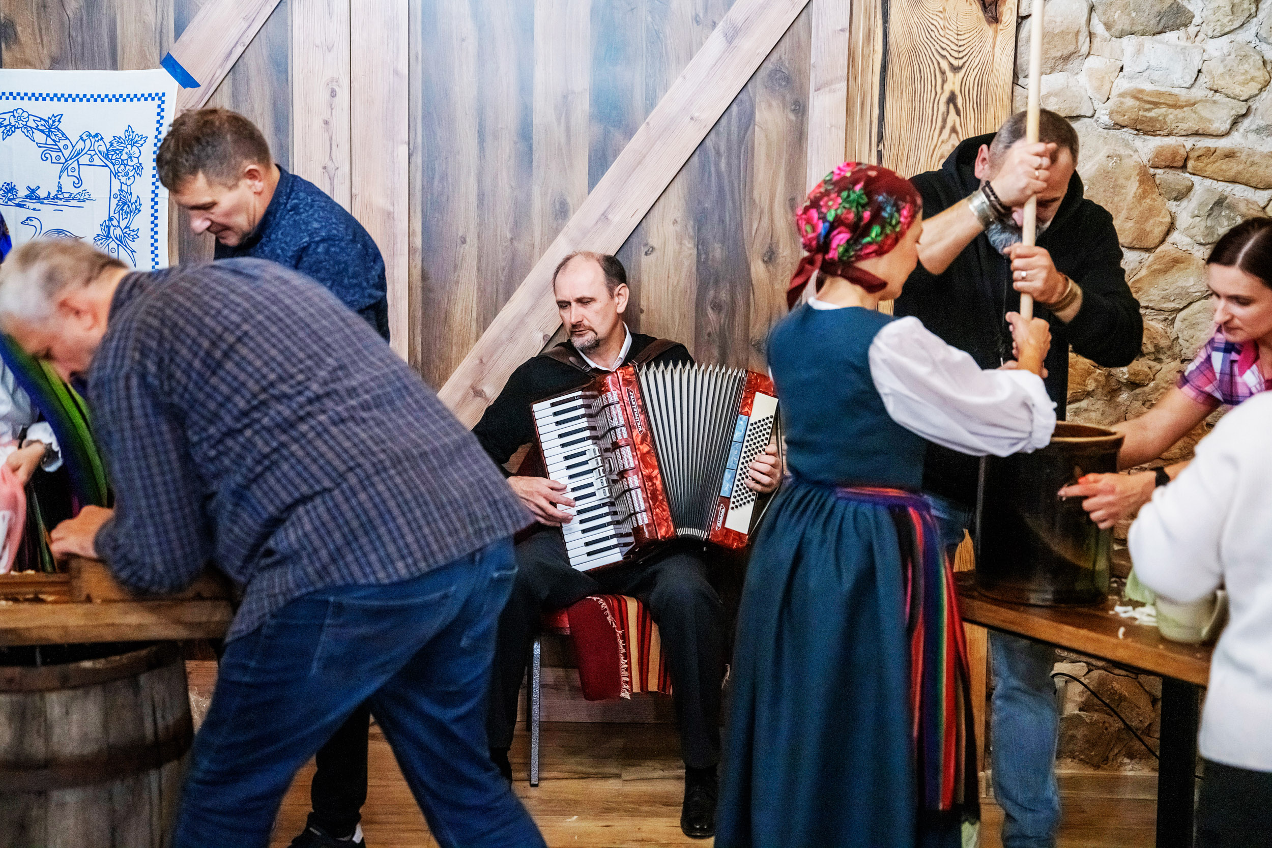 Z sobotniego kiszenia też nikt nie wyszedł głodny, po wspólnej pracy był poczęstunek i zabawa. Panie przygotowały same tradycyjne smakołyki – oprócz ziemniaków z ogniska była kapusta z grochem, prawdziwe masło, chleb ze smalcem i ogórkiem kiszonym czy drożdżowe ciasto. Po posiłku mieszkańcy ruszyli do tańca, a przygrywał im na akordeonie Krzysztof Margas.