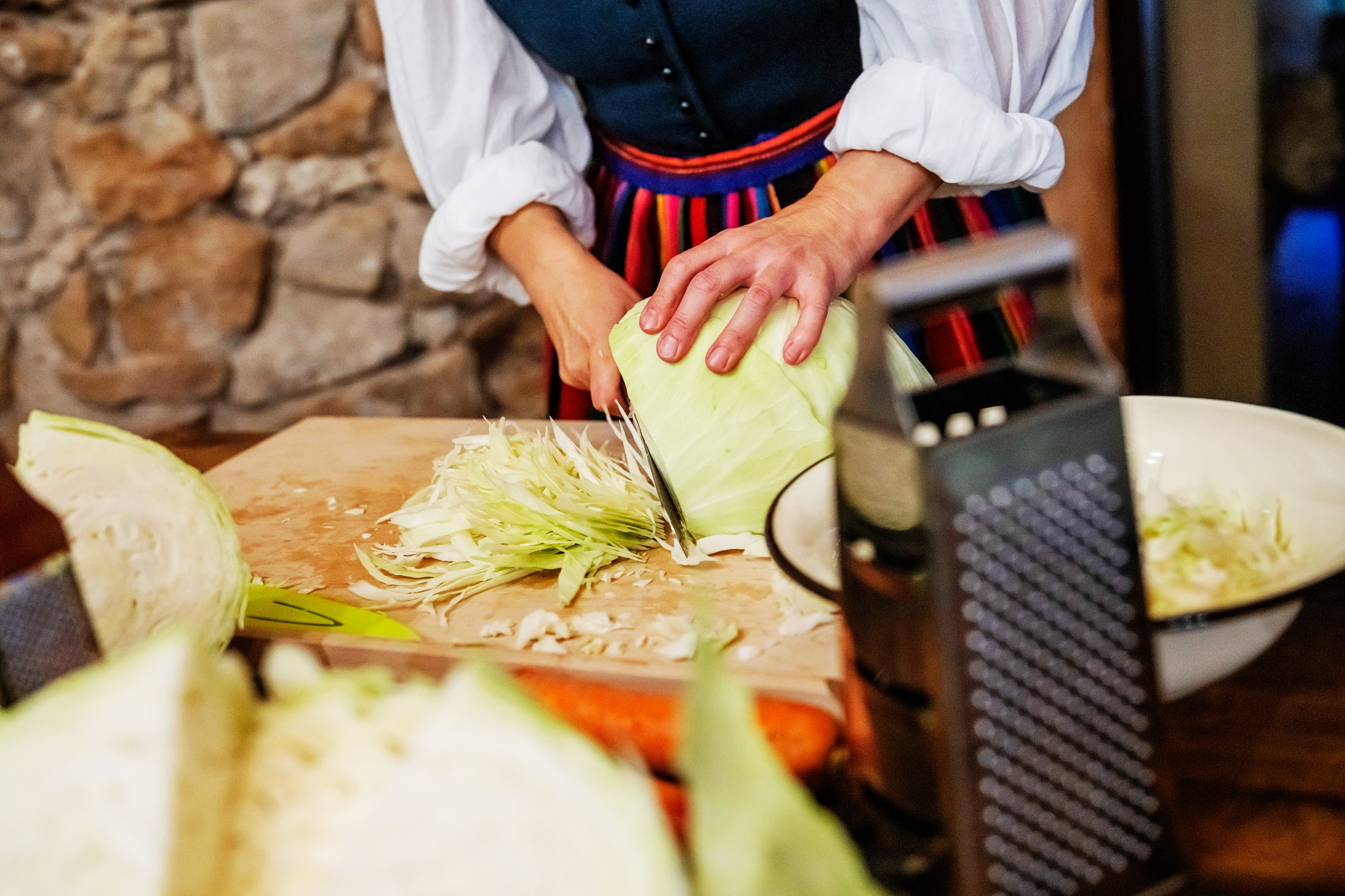 Zanim pokrojone warzywo trafiło do beczki, została ona wyparzona. To także odbyło się starą metodą – dębowa beczka została wypełniona wrzątkiem w którym został zanurzony kamień rozgrzany wcześniej w ognisku. W tym samym ognisku piekły się ziemniaki, które po ciężkiej pracy jedli później uczestnicy wieczoru kiszenia kapusty po staremu. Było też mycie nóg przed deptaniem warstw warzyw, a także ubijanie kapusty drewnianą pałą.