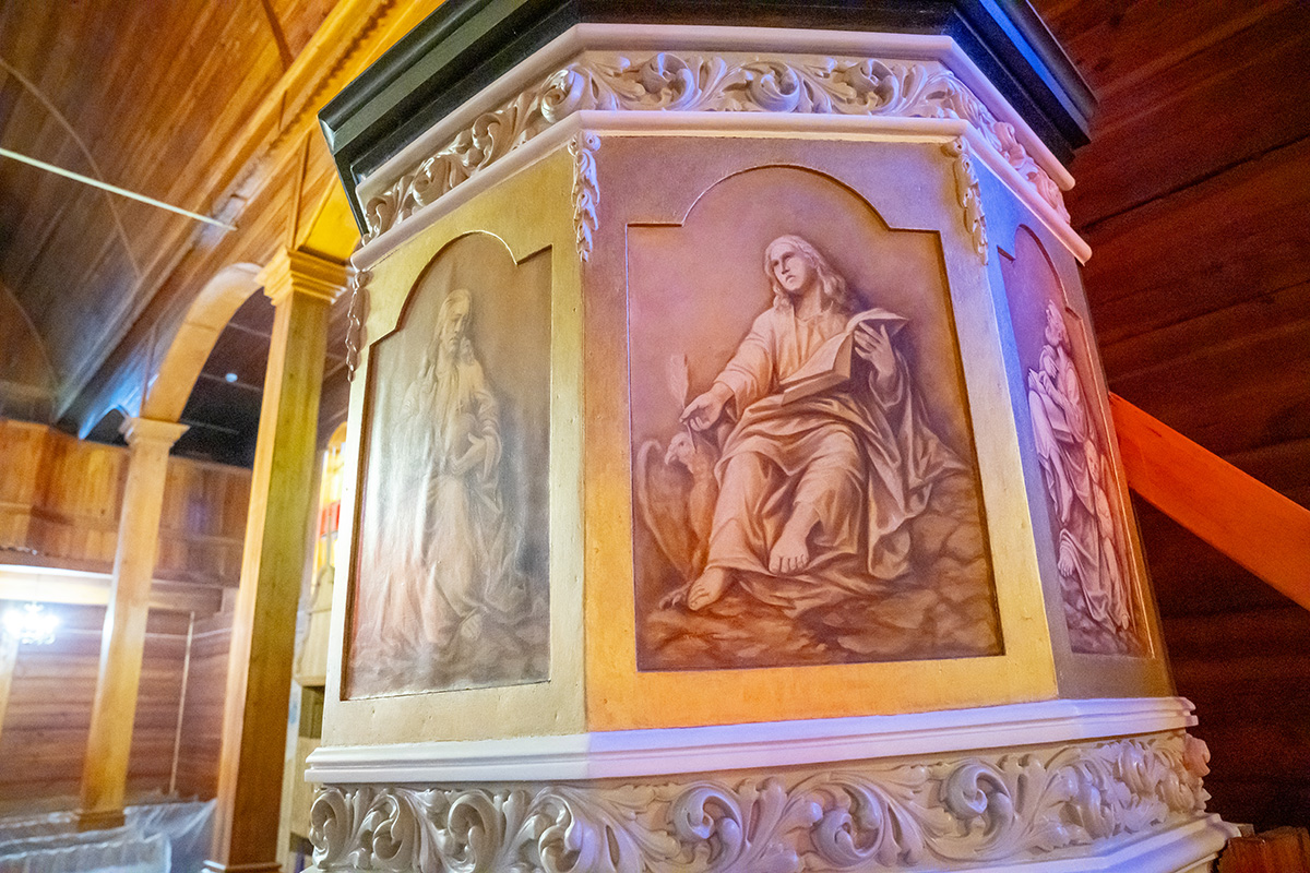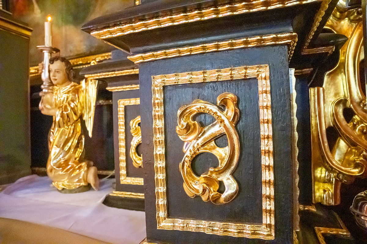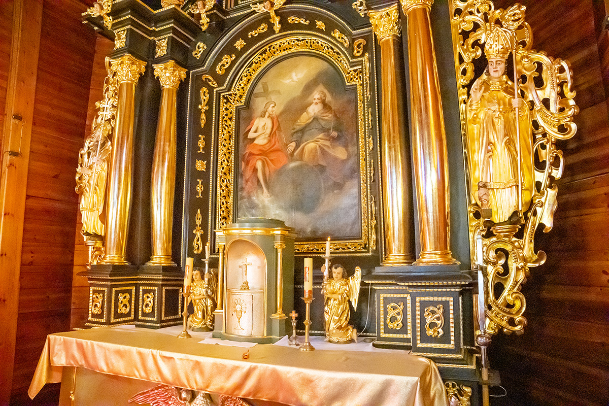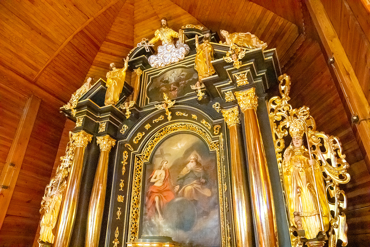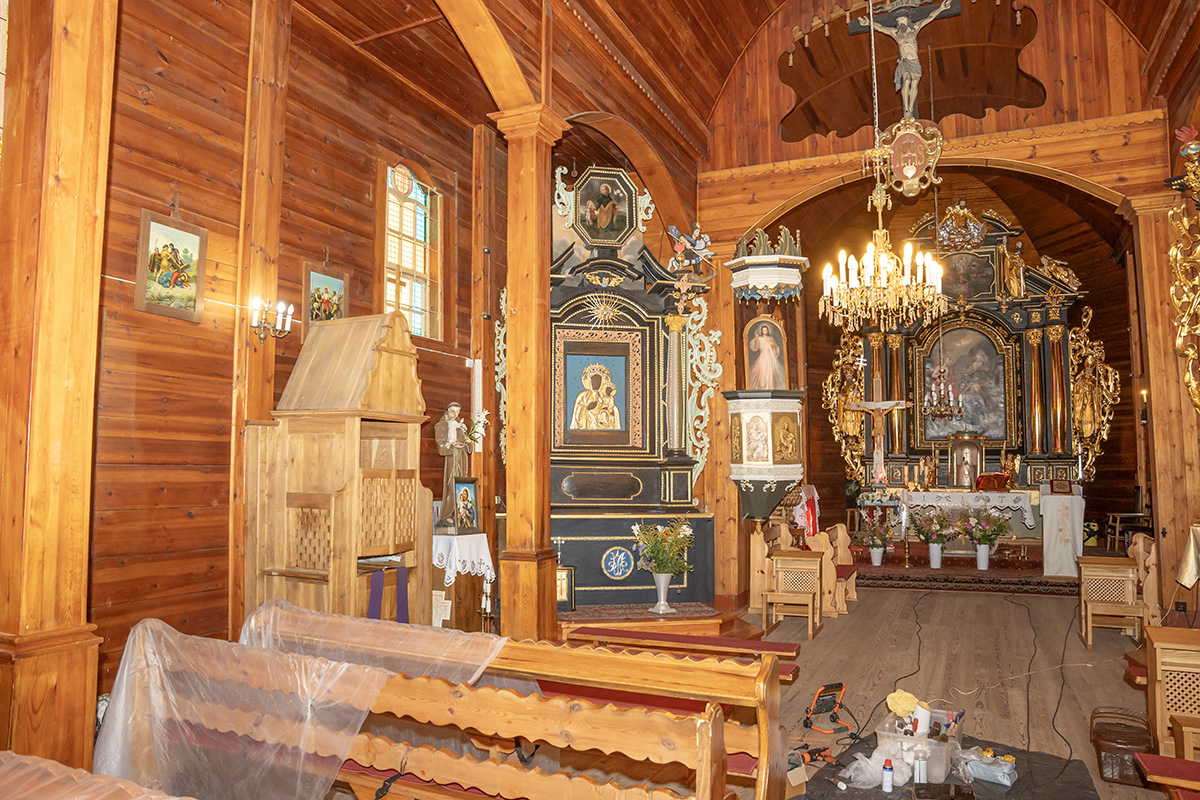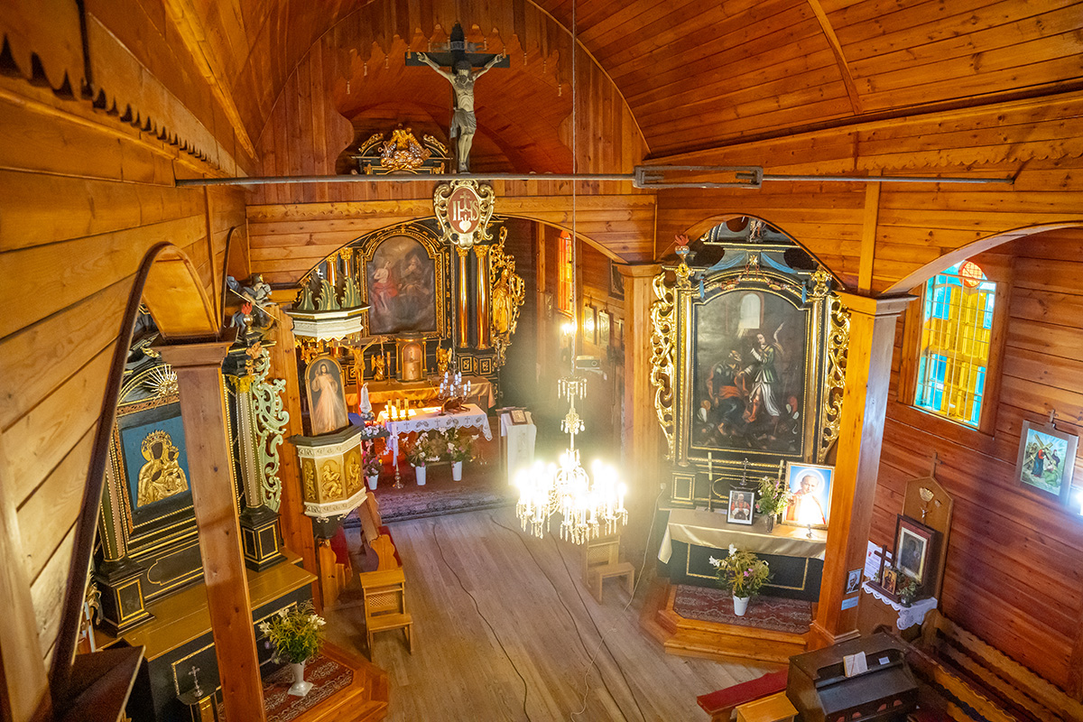 Wnętrze świątyni zachwyca prostotą i ciepłem naturalnego drewna. Nawa główna i prezbiterium mają sklepienie kolebkowe, a przestrzeń kościoła dzielą trzy nawy wsparte na masywnych słupach. W ołtarzu głównym oraz dwóch bocznych odnaleźć można wczesnobarokowe formy pochodzące z XVII wieku — prawdziwe perły dawnego rzemiosła snycerskiego. Ambona, choć wykonana w późniejszym okresie, zdobiona jest rokokowym baldachimem, który dodaje wnętrzu lekkości.