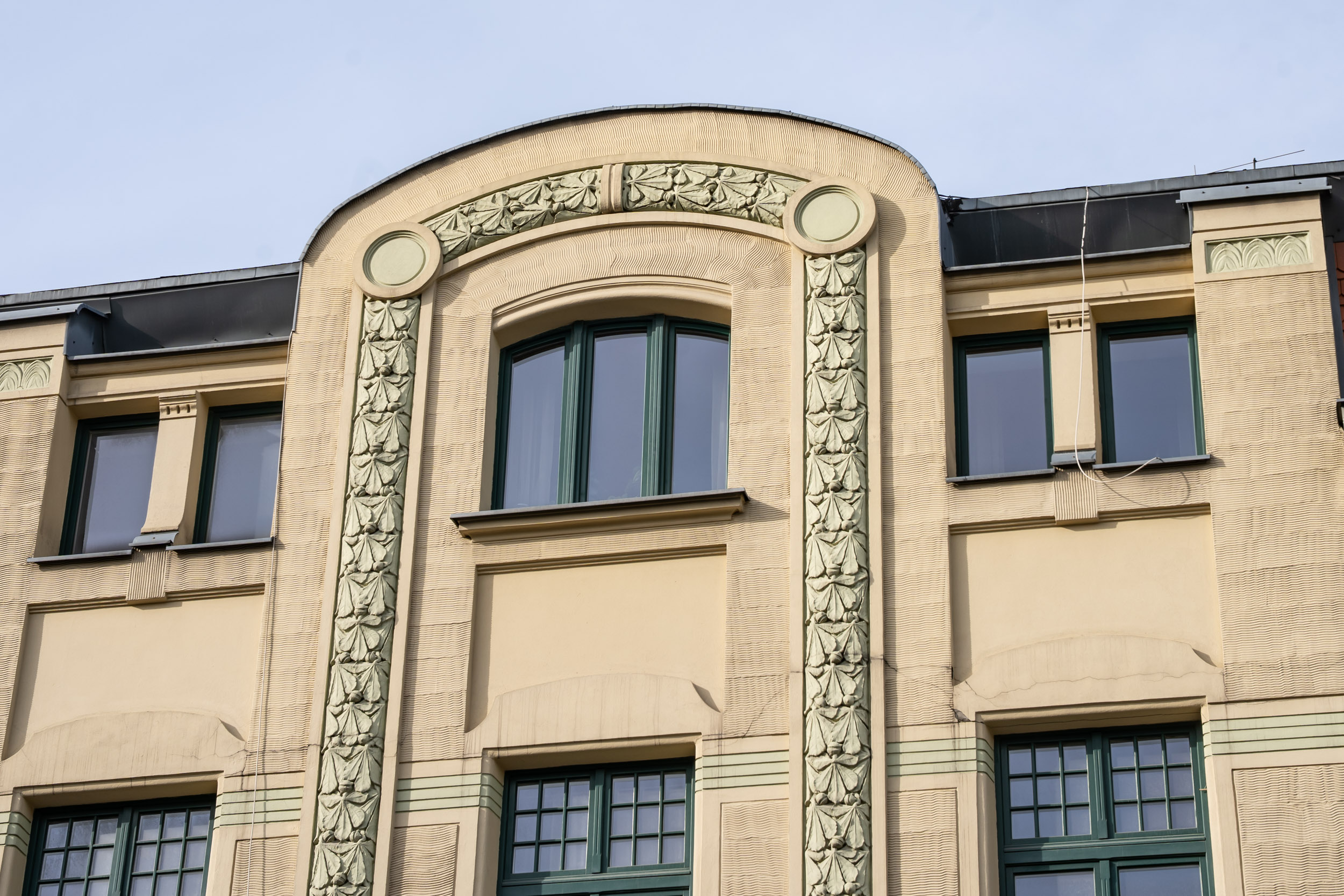 Przy rozbudowie kamienicy o kolejne piętro na początku XX wieku, fasadę upiększono secesyjnymi zdobieniami. Charakterystyczne jest, że kamienica nie jest symetryczna. Ryzalit, czyli wysunięta część elewacji budynku, dzieli go na nierówne części.