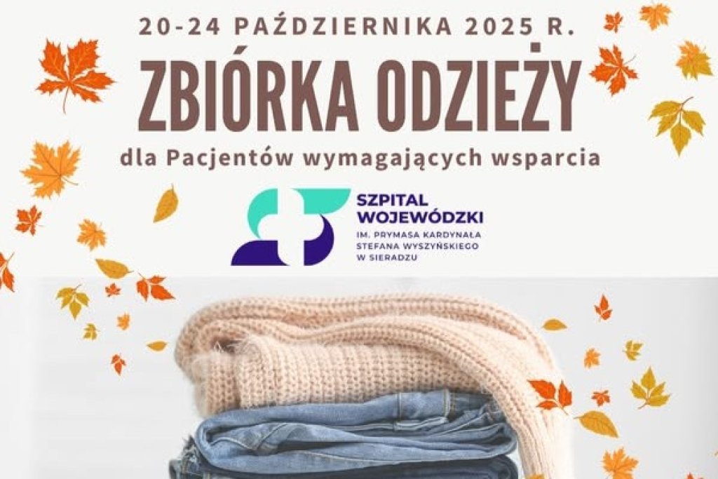 poniedziałek, 20 października 2025W Szpitalu Wojewódzkim w Sieradzu, podległym Urzędowi Marszałkowskiemu Województwa Łódzkiego, ruszyła zbiórka odzieży dla pacjentów znajdujących się w trudnej sytuacji życiowej. Buty, swetry, czapki, kurtki, spodnie, bluzy, szale i rękawiczki można przekazywać do piątku, 24 października.