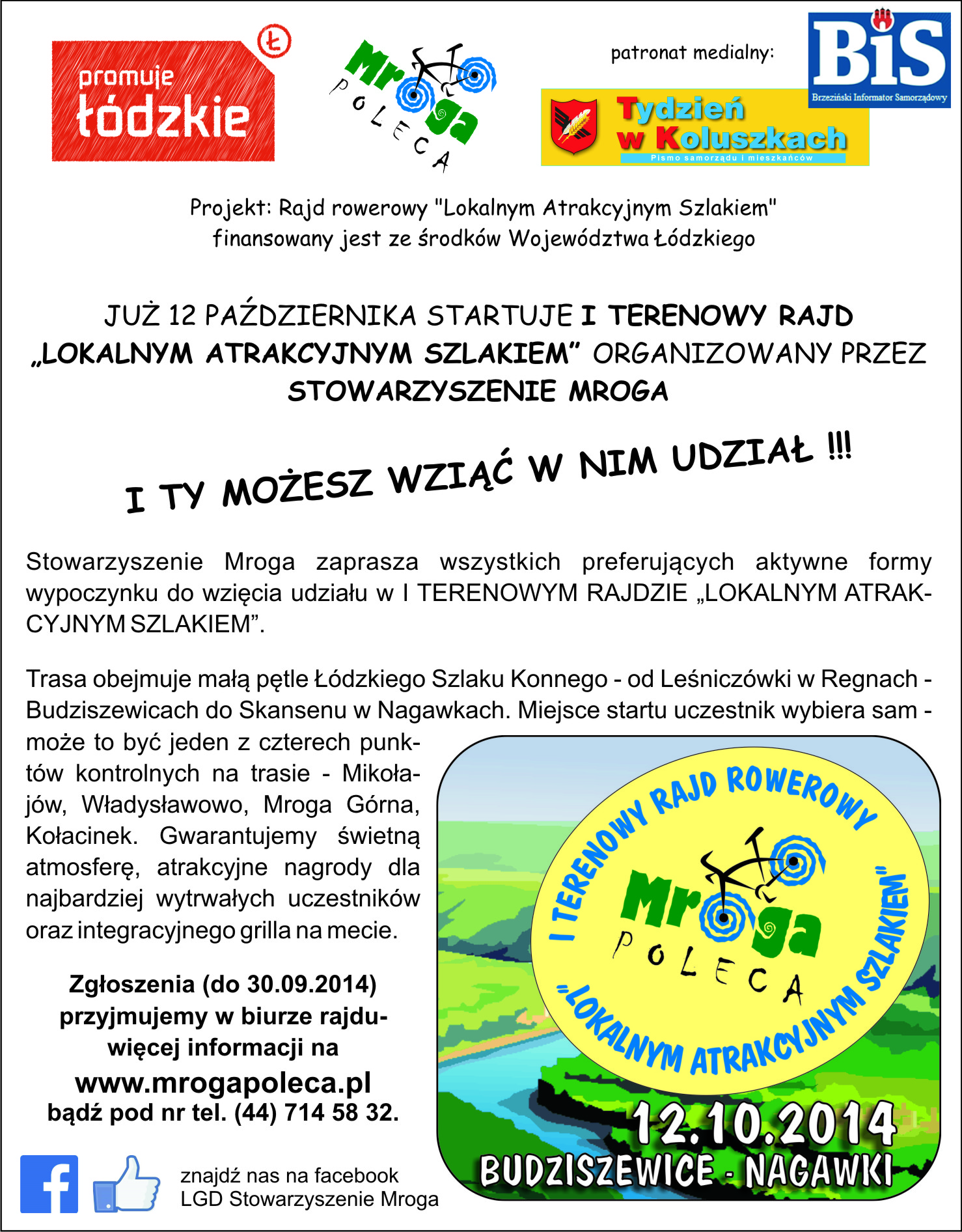 Stowarzyszenie „Mroga” zaprasza wszystkich preferujących aktywne formy wypoczynku do wzięcia udziału w I TERENOWYM RAJDZIE ROWEROWYM „LOKALNYM ATRAKCYJNYM SZLAKIEM”, który odbędzie się 12 października 2014 r.